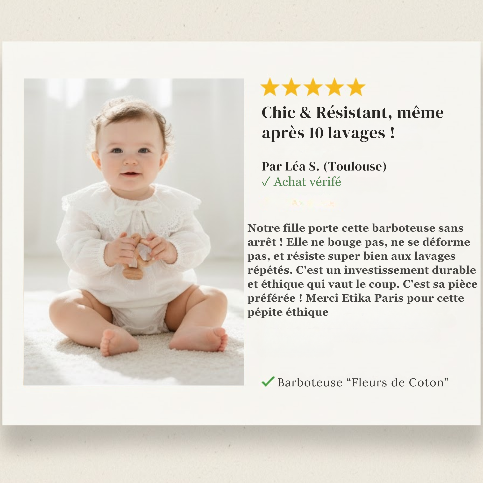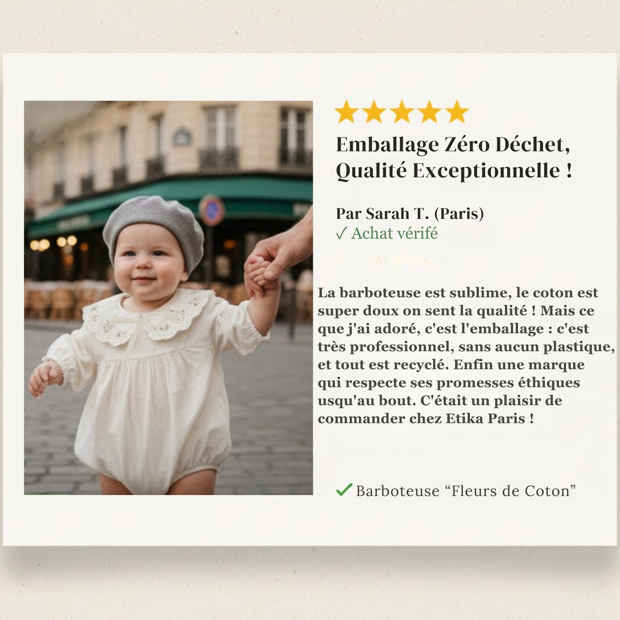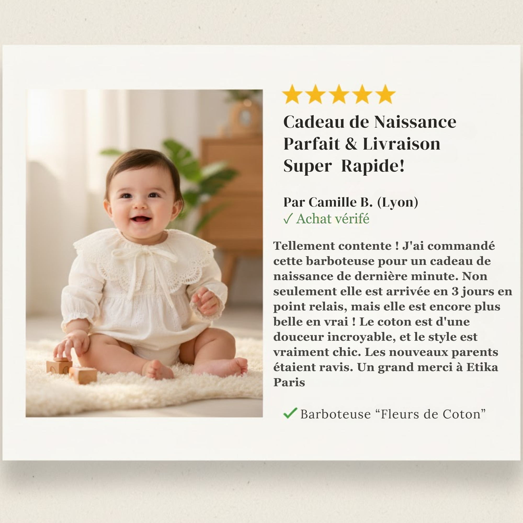 Chaque pièce offre un confort et une élégance remarquables. Nos barboteuses tendance sont dotées de détails raffinés et de boutons pressions pour une praticité optimale. Que vous cherchiez une barboteuse unisexe de qualité à manches longues ou une tenue complète bébé pour un cadeau de naissance pour une cérémonie comme un baptême, nos vêtements s'adaptent à chaque saison. Découvrez notre choix de tailles et nos accessoires de mode enfant pour un look moderne bébé et tendance.